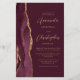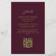 A borda esquerda deste elegante convite de casamento moderno apresenta uma cor vermelha e borrifada, com uma falsa brilha de ouro. O texto personalizável combina um script dourado e fontes sans serif em um fundo burgundy. O verso fornece espaço para detalhes do casamento em um fundo sólido de burgundy, junto com um código QR que os convidados podem digitalizar para visitar seu site e RSVP, o que economiza o custo de imprimir e enviar cartões RSVP separados.