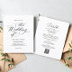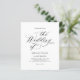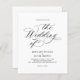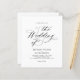 Este convite para o casamento apresenta uma design elegante e minimalista, com a caligrafia negra clássica e fontes serif em fundo branco.