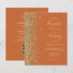 A borda esquerda deste elegante convite de casamento moderno apresenta uma borda falsa de ouro. O texto personalizável combina manuscrito pálido de cor dourada, fontes copperplate e itálico em um fundo laranja queimado. O verso fornece espaço para detalhes do casamento em um fundo laranja queimado sólido, junto com um código QR que os convidados podem digitalizar para visitar seu site e RSVP.