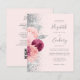 A borda esquerda deste elegante convite de casamento moderno apresenta um buquê floral em tons de burgundy e rosa-pincel, aparados com folha de falso prateado e folhagem de falso brilho e borrifados com brilho de prata. O texto personalizável combina o script de escrita manual de cinzas, as fontes em copperplate e itálico em um plano de fundo de blush. Adicione mais detalhes no verso, juntamente com um código QR para ajudar seus convidados a visitar seu site de casamento.