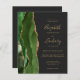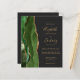 A borda esquerda deste elegante convite de casamento moderno apresenta um caçador de aquarela verde agata borda com falsa brilho dourado. O texto personalizável combina manuscrito dourado, fontes em copperplate e itálico em um fundo fora de preto. O verso oferece espaço para detalhes do casamento, juntamente com um código QR que os convidados podem digitalizar para visitar seu site e RSVP, o que economiza o custo de impressão e envio de RSVP separados