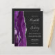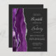 A borda esquerda deste elegante convite de casamento moderno apresenta uma cor d'água roxa, borda agitada com falso brilho prateado. O texto personalizável combina escrita manual, placa de impressão e fontes itálicas em cinzas prateadas em um fundo fora do preto. Adicione mais detalhes no verso, juntamente com um código QR para ajudar seus convidados a visitar seu site de casamento.