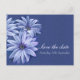 Uma pintura de arte impressionante, o casamento de osteopermum agendou, salve o convite de data. Casamento simples e romântico, salvem o convite, em tons roxos azuis e brancos a tons lilás. Design de casamento clássico do conjunto de papéis de carta românticos de margarida. Edite esta opção para salvar o cartão postal do casamento com seus nomes, datas e textos próprios. Incrivelmente pintada em guache em papel escuro pela artista e designer Sarah Trett.