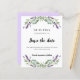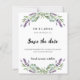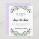 Um moderno e elegante Salve a Data para um casamento. Um fundo branco decorado com flores lavandas e verde de eucalipto. Personalize e adicione uma data e seus nomes. O texto: Salvar a Data é gravado com um script de estilo com letra de tendência grande. Fundo: fundo colorido de lavanda. 1 folha = 1 convite impresso de borda a borda.