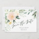 Cartão de aviso de casamento com flores e folhagens em aquarela rosa claro.