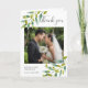 Cartão de agradecimento com elegante caligrafia, apresentando folhas frescas de prado emoldurando sua foto de casamento favorita, nomes e data especial. Você pode personalizar a mensagem de agradecimento no interior. Uma maneira perfeita de dizer obrigado!