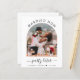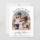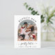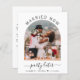 Um elopeio de orçamento ou um anúncio de casamento menor para informar a família e os amigos que seus planos de casamento mudaram e você fugiu ou reduziu o número de convidados no seu casamento para um pequeno grupo íntimo, e que você vai receber uma festa de celebração no futuro. A frente apresenta sua foto em um quadro arquivado e "Casado Agora, Festa Mais Tarde" em uma mistura de tipografia moderna e roteiro de tendências. Sob sua foto você pode adicionar seus primeiros nomes e a data do casamento. No verso, você pode personalizar sua mensagem em mais detalhes e adicionar seus nomes em um script semelhante a assinatura.