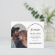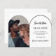 Uma foto Salve o cartão de data do seu casamento. Na frente: adicione seu próprio dentro de foto de tamanho vertical ao quadro de fotos de arco. Um fundo branco chic, texto preto. Modelos para nomes e data. O nome e o texto: Salvar a Data são escritos com um script de estilo moderno com letra manual. Voltar: você pode adicionar mais texto se quiser. Vá para a ferramenta design e adicione a camada traseira. 1 folha = 1 Salve a data da borda impressa para a borda.