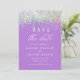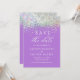Casamento com brilho roxo Salve os Cartões de Data com um plano de fundo roxo acentuado com brilho iridescente e seu personalizado salva as informações de data. Personalize com seu texto editando o texto nas caixas de texto fornecidas. Projetado para você por ©Evco Studio www.zazzle.com/store/evcostudio