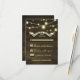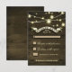 cartões de RSVP de CASAMENTO RÚSTICO NO CAMPO com fundo de madeira desgastada, luzes de corda cintilantes e tipografia estilosa com uma faixa.