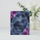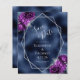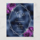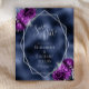 Este elegante casamento moderno, exceto o cartão de data, apresenta uma imagem geométrica prateada decorada com buquês florais roxas e prateadas num fundo azul marinho. O texto personalizável combina a escrita manual imétrica de cinzas prateadas, a placa de cobre e as fontes itálicas. O verso repete a imagem da folha azul marinho.