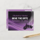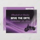 Casamento de motociclista roxo Salve o cartão-postal Data, com uma motocicleta em um fundo roxo e preto de abstrato e uma malha branca. Alguns elementos são cortesia de Clipartandfonts.com.