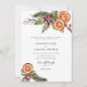Cartão de convite para o casamento russo para o tema do Natal, com ilustração aquosa de botânicos de inverno, incluindo, maleta, ramal de pinheiros, bagas, laranja, etc.