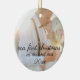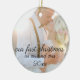 Belo presente de Natal para recém-casados. Este feriado, envie esta linda foto de Natal do casamento para celebrar o casamento. Nossa primeira decoração de Natal é adorada com uma linha preta manuscrita com espaço para uma foto. Personalize o ornamento substituindo imagens e texto. Para obter melhores resultados, use uma imagem recortada como um quadrado. Mais estilos e envelopes correspondentes, selos postais, papel de embrulho de presente, etc. Também disponível em nossa loja. Entre em contato diretamente com o designer se você tiver uma solicitação de personalização de design.
