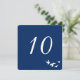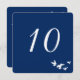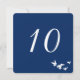 Design de cartão de número de mesa simples e elegante totalmente personalizável. O bando de pássaros é branco e tem um fundo transparente para que você possa alterar a cor da impressão do papel para combinar com o tema do seu evento. Todas as áreas de texto podem ser personalizadas. O fundo azul padrão é ótimo para casamentos à beira-mar ou casamentos judaicos.