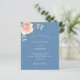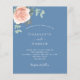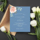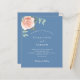 Um fundo azul empoeirado. Decorados com ouro-rosa e folhas de eucalipto cor-de-rosa-esbranquiçada, flores de rosa e cor-de-rosa-esbranquiçada, galhos, verde e borras de ouro. Personalize e adicione seus nomes e detalhes do casamento. 1 folha = 1 convite impresso de borda a borda.