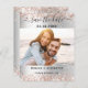 Um casamento moderno Salve o cartão com fotos de Data. Um fundo com aspecto sujo de prata decorado com rosa dourado confetti. Personalize e adicione sua foto, detalhes do casamento e seu próprio código qr ao seu site de casamento. Este cartão está disponível em nossa loja sem o código QR na parte traseira.