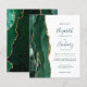 A borda esquerda deste elegante convite de casamento moderno apresenta uma esmeralda verde aquarela agate borda com falsa brilho dourado. O texto personalizável combina o script de escrita manual, o compósito e as fontes itálicas em verde esmeralda em um fundo branco. O verso apresenta um design emerald verde e dourado.