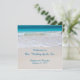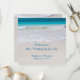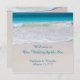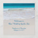 Votos costeiros, bem-vindos ao nosso casamento no mar. Personalize o texto impresso na frente deste programa casual de casamento de praia. Água bonito e tropical do oceano e areia lisa da praia é a imagem de fundo em ambos os lados deste jornal com texto azul, escrito.