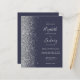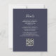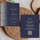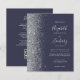 A borda esquerda deste elegante convite de casamento moderno apresenta uma borda falsa de prata. O texto personalizável combina a escrita manual de cinzas prateadas, fontes copperplate e itálico em um fundo azul escuro. Adicione mais detalhes no verso, juntamente com um código QR para ajudar seus convidados a visitar seu site de casamento.
