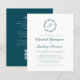 Este elegante design de convite de casamento apresenta um monograma de escrita azul teal rodeado por uma coroa botânica de arte de linha. Os nomes aparecem no script teal, com o resto do texto na fonte de serif clássica. O verso fornece espaço para detalhes do casamento em um fundo azul-lacre sólido, junto com um código QR que os convidados podem digitalizar para visitar seu site e RSVP.