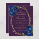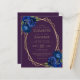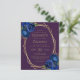 Este design apresenta uma moldura geométrica dourada decorada com buquês florais de cor azul-real e verde-aquosa, circundando o texto dourado sobre fundo roxo profundo. O verso fornece espaço para detalhes do casamento em um fundo roxo sólido, junto com um código QR que os convidados podem digitalizar para visitar seu site e RSVP, o que economiza o custo de imprimir e enviar cartões RSVP separados.