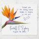 Rótulos de garrafa com flores de ave do paraíso. Flores laranja exóticas para um casamento tropical / havaiano impressas em rótulos brancos com os nomes do casal e data do casamento. Adicione também uma curta mensagem de "obrigado", com um pequeno coração desenhado à mão abaixo do texto. Este design caberá nos rótulos maiores, como os de garrafas de cerveja, vinho e vinho espumante. Não deixe que nenhuma palavra se aproxime das bordas.