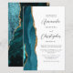A borda esquerda deste elegante convite de casamento moderno apresenta uma cor azul-lacrimogênea agata borda com falsa brilho dourado. O texto personalizável combina o script de cinza de carvão e as fontes sans serif em um fundo branco. Um design de agate de coleira correspondente é exibido na parte traseira da placa.