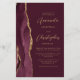A borda esquerda deste elegante convite de casamento moderno apresenta uma cor vermelha e borrifada, com uma falsa brilha de ouro. O texto personalizável combina um script dourado e fontes sans serif em um fundo burgundy. Um design de agate burgundy correspondente aparece na parte traseira do cartão.