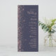 A borda esquerda deste elegante programa de casamento moderno apresenta um rosa dourado faux glitter design. O texto personalizável combina manuscrito colorido de rosa pálido, fontes copperplate e itálico em um fundo azul escuro.