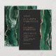 A borda direita deste elegante e moderno convite de casamento apresenta uma esmeralda verde aquarela agate borda aparada com falsa rosa dourada. O texto personalizável combina fontes poeirentas cor-de-rosa rosa, copperplate e itálico num fundo preto ardente. O verso apresenta um design emerald verde e rosa dourado.