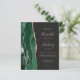 A borda esquerda deste elegante convite de casamento moderno apresenta uma esmeralda verde aquarela agate borda aparada com falsa rosa dourada. O texto personalizável combina a letra rosa-rosa, a letra copperplate e a letra itálico num fundo preto estável. O verso apresenta um design emerald verde e rosa dourado.