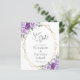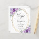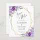 Este elegante casamento moderno salva o cartão de data apresenta uma estrutura geométrica dourada decorada com buquês florais roxos e lilases e verde de eucalipto em fundo branco. O texto personalizável combina cinzas carvões com escrita manuscrita, copperplate e fontes itálicas. O verso é branco sólido. (NOTA: Os envelopes não são incluídos automaticamente com este convite orçamental. Para adicionar envelopes ao seu pedido, use o menu suspenso "Envelopes".)