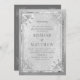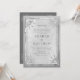 Uma laje de rocha torrada de prata é o pano de fundo para este dramático convite metálico cercado de prata com espumante moldura de prata, traçado à mão, com tipografia clássica e formal.