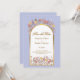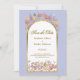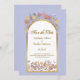 Design de jardim de flores silvestres, coloridas e elegantes, em tons de lavanda, amarelo e pêssego com arco de ouro sobre fundo de sombra periwinkle e tipografia de na moda com monograma no verso. É tão romântico e floral para aquele dia especial da sua vida.