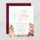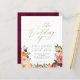 Elegante convite para o casamento floral que inclui "o casamento de" em um roteiro de ouro falso contra um fundo branco com flores de cor d'água e flores de cor d'água e folhagem em baixo, enquadrando os detalhes do casamento. Como parte da seleção do orçamento aqui no Zazzle, esses convites vêm em tamanhos limitados e estoques de papel. Se você precisar de um tamanho ou estoque de papel diferente, esse design pode ser transferido para um formato padrão 5x7 usando a ferramenta de transferência design para obter mais opções.