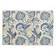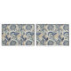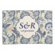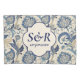 Bolsas de ouro com design floral de monograma azul e creme, bem como as iniciais e a data de casamento da noiva e do noivo.