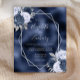 Este elegante convite de casamento moderno apresenta um quadro geométrico prateado decorado com buquês florais azuis, marinhos e prateados empoeirados num fundo de folha azul marinho. O texto personalizável combina a escrita manual imétrica de cinzas prateadas, a placa de cobre e as fontes itálicas.