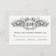 Cartão de resposta RSVP de casamento floral preto e branco. Mostra uma crista herdada com flores. O verso inclui um padrão de bolinhas preto e branco.