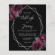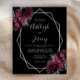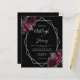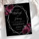 Este elegante convite de casamento moderno apresenta um quadro geométrico de prata decorado com flores de burgundy e prata num fundo preto. O texto personalizável combina a escrita manual imétrica de cinzas prateadas, a placa de cobre e as fontes itálicas. O reverso é preto sólido.