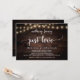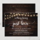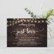 Linda festa de celebração de amor, nada de chique, apenas anúncio de casamento fugitivo / cartão de convite, em design de madeira rústica de fazenda e luzes de corda. Isso é perfeito para o seu casamento e festa de celebração pós-casamento. Adicione seus detalhes em fonte / letra correspondente.