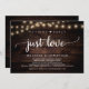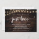 Linda festa de celebração de amor, nada de chique, apenas amor, Anúncio de Casamento Fugitivo / Cartão de convite, em design de madeira rústica de fazenda, luzes de corda. Isto é perfeito para o seu casamento e festa de celebração pós-casamento. Adicione seus detalhes em fonte / letra correspondente.