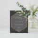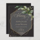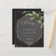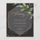 Orçamento O moderno elegante eucalipto verde-ouro geométrico num fundo negro de carvão em contraste, convite de casamento.