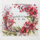 O champanhe bonito rotula uma coroa de flores vermelhas, bagas vermelhas, paus e galhos. Adicione seus nomes e data de casamento. Conteúdo genérico