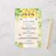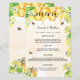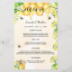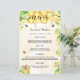 Um cardápio de casamento para um casamento no verão. Abelhas bonitas, florais amarelos e mel pingando de favos. Personalize e adicione seus nomes, data e menu de casamento. A palavra Menu é escrita com um script de estilo alfanumérico com letra de tendência com alternâncias.