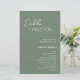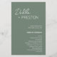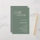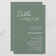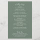 Programa moderno de casamento verde-oliva/sábio com um design simples e mínimo com o nome da noiva em um roteiro elegante e o nome do noivo em uma fonte moderna de sans serif. Abaixo, no canto inferior direito, estão os detalhes do evento e a ordem da cerimônia em um layout minimalista. A parte de trás tem a sua festa de casamento e obrigado.