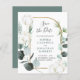 Boho de Orçamento Salva a data do lançamento do Casamento no inverno de algodão Eucalyptus... Nosso casamento no inverno de barato Salvar a Data apresenta os pinos de algodão macio entrelaçados com ramificações de eucalipto em uma moldura geométrica dourada que faz fronteira com o texto do convite. Com suas lindas folhas de cor verde-clara e poeirenta-escura, esses buquês de eucalipto-chic em moda criam uma ilustração atraente para uma queda ou casamento no inverno tardios. Todo texto de exemplo na frente - e atrás - da placa pode ser facilmente revisado no modelo de personalização.