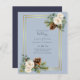 Lindas rosas brancas, folhas de Eucalyptus, cones rústicos de pínus e um quadro de ouro neste item de casamento no inverno que faz parte de uma coleção maior que inclui convites para casamento orçados, salvar as datas, RSVPs, etiquetas, presentes, papelaria e muito mais. Para um planejamento GRATUITO de casamentos no inverno, visite weddingdesignchic.com.