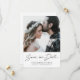 Este simples casamento de fotos em chic, salve a data, o modelo de carta lisa apresenta um simples design com um sabor quente e minimalista. A frente apresenta seus primeiros nomes sob sua foto favorita e uma mensagem exclusiva de 'Salvar nossa Data' em letra manuscrita que nós primeiramente escrevemos à mão e depois adaptamos para esta placa. Também incluímos isso nas costas. O texto 'Salvar nossa Data' está em preto padrão e seus detalhes abaixo são um preto ligeiramente suavizado. Você pode mudar a cor do texto dos nomes para ouro ou outra cor. O elemento design 'Salvar nossa Data' não pode ser alterado, mas você pode optar por removê-lo da parte de trás para uma aparência ainda mais simples. No verso, você pode, claro, além de substituir nossas informações de exemplo por suas, excluir campos de texto que você não precisa, ou alterar o texto, bem como alterar a fonte, o tamanho e a cor. Você pode, por exemplo, mudar 'está se casando' para 'está casando', etc., ou excluir o endereço do site de exemplo sem substituí-lo pelo seu próprio, ou substituí-lo por uma mensagem totalmente diferente. O texto no verso é uma mistura de preto padrão (#00000) e um preto ligeiramente suavizado (#1c1c1c) e você pode facilmente alterar isso se quiser.A cor de fundo padrão em ambos os lados é definida como transparente, para que a cor do papel sirva simplesmente como tom base. Mas você pode editar isso e escolher uma cor para o plano de fundo e mudar a aparência de um ou de ambos os lados para se adequar ao seu estilo. Personalize este elegante casamento moderno, salve o modelo de cartão plano com sua foto e sua inspiração e torne-o exclusivamente seu!