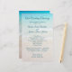 Bordo do casamento marítimo, programa de cerimônias de praia com texto personalizado de um lado. Criado a um simples evento costeiro, este documento oferece três tamanhos e opções de papel matto, cetim, feltro ou outro. A imagem de fundo é areia e surf com água azul no topo da página. A fonte do script elegante é azul escuro. O reverso também contém uma imagem de praia com mais água azul-mar brilhante e areia lisa.